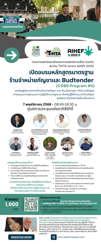 The Department of Thai Traditional and Alternative Medicine, in collaboration with the Thai Industrial Hemp Trade Association (TiHTA) and AIHEF 2025, proudly presents: